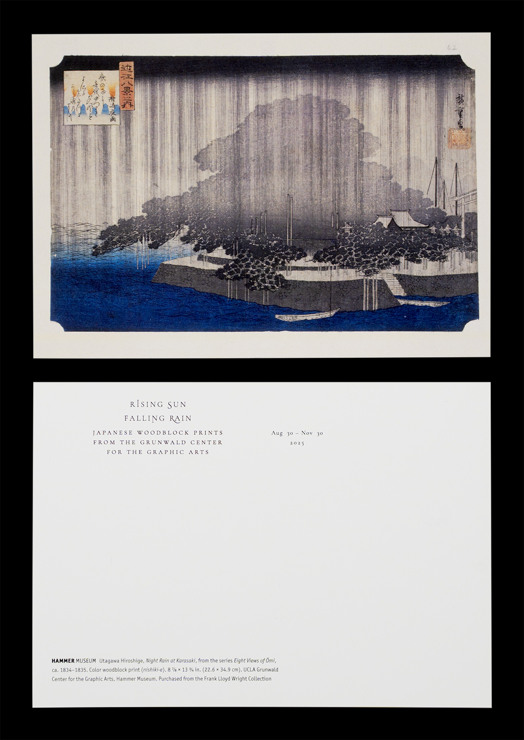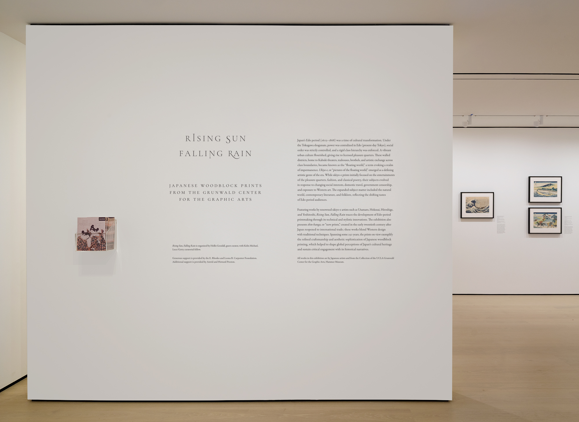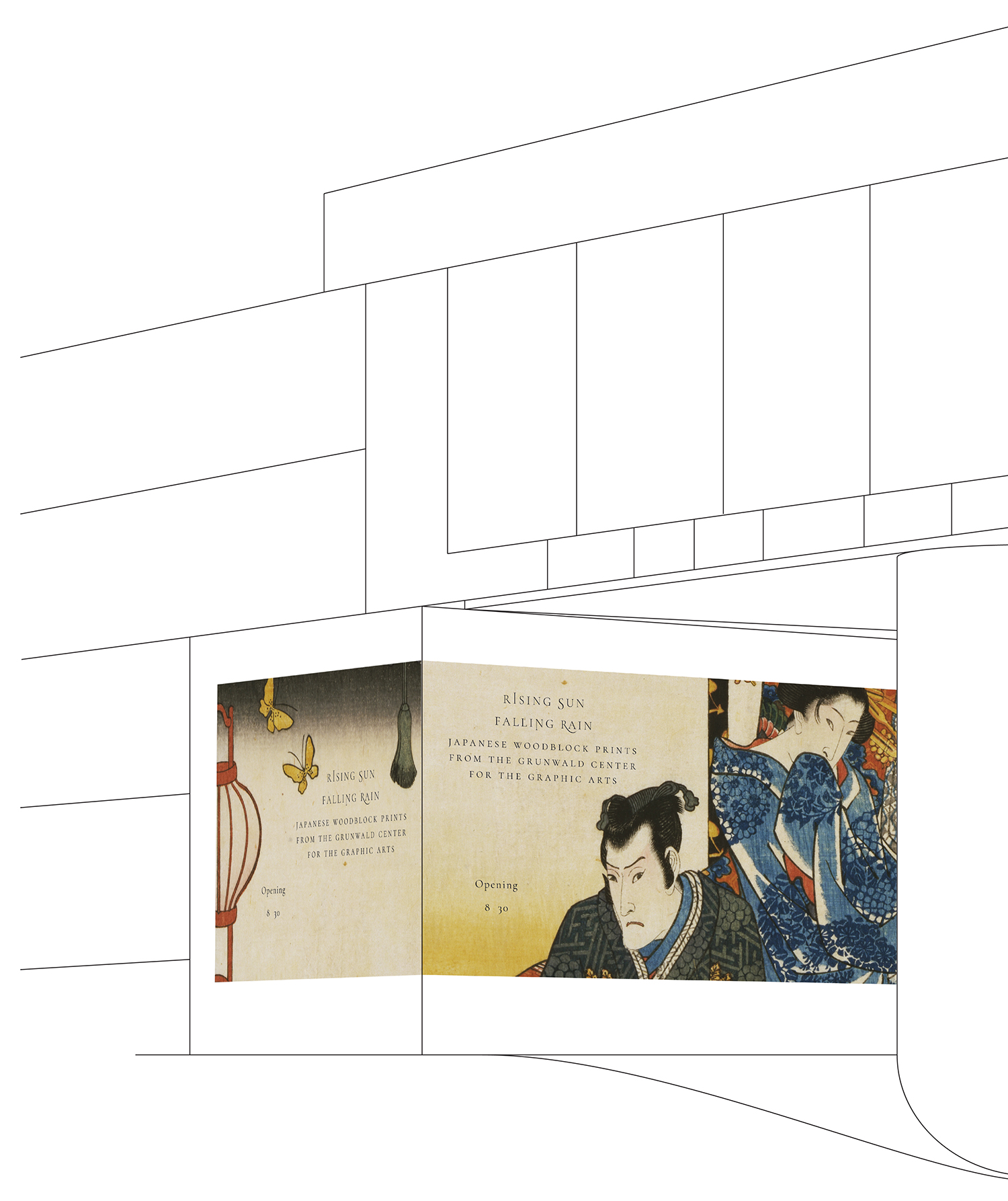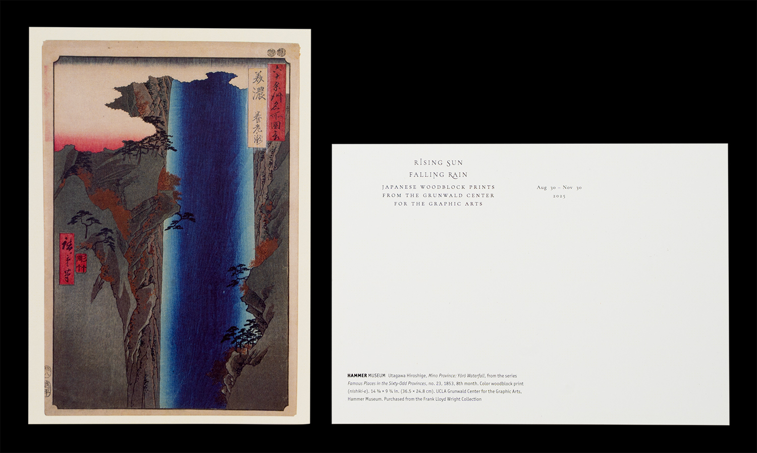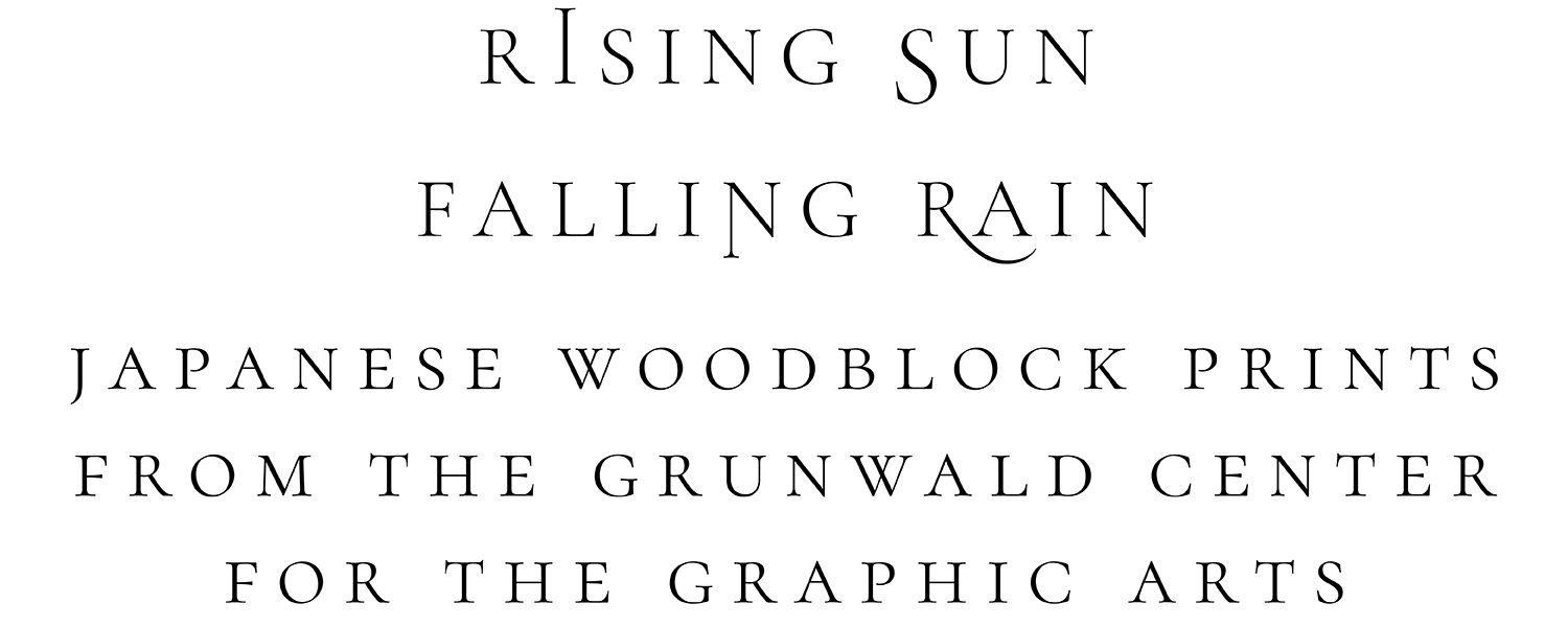 rising sun, falling rain: japanese woodblock prints from the grunwald center for the graphic arts traces the evolution of ukiyo-e printmaking and the later shin-hanga movement. the exhibition features over eighty prints, including works by katsukawa shunshō, utagawa toyokuni, katsushika hokusai, utagawa hiroshige, tsukioka yoshitoshi, and kawase hasui. i've set the identity in cormorant garamond, modified with custom drawn swashes.