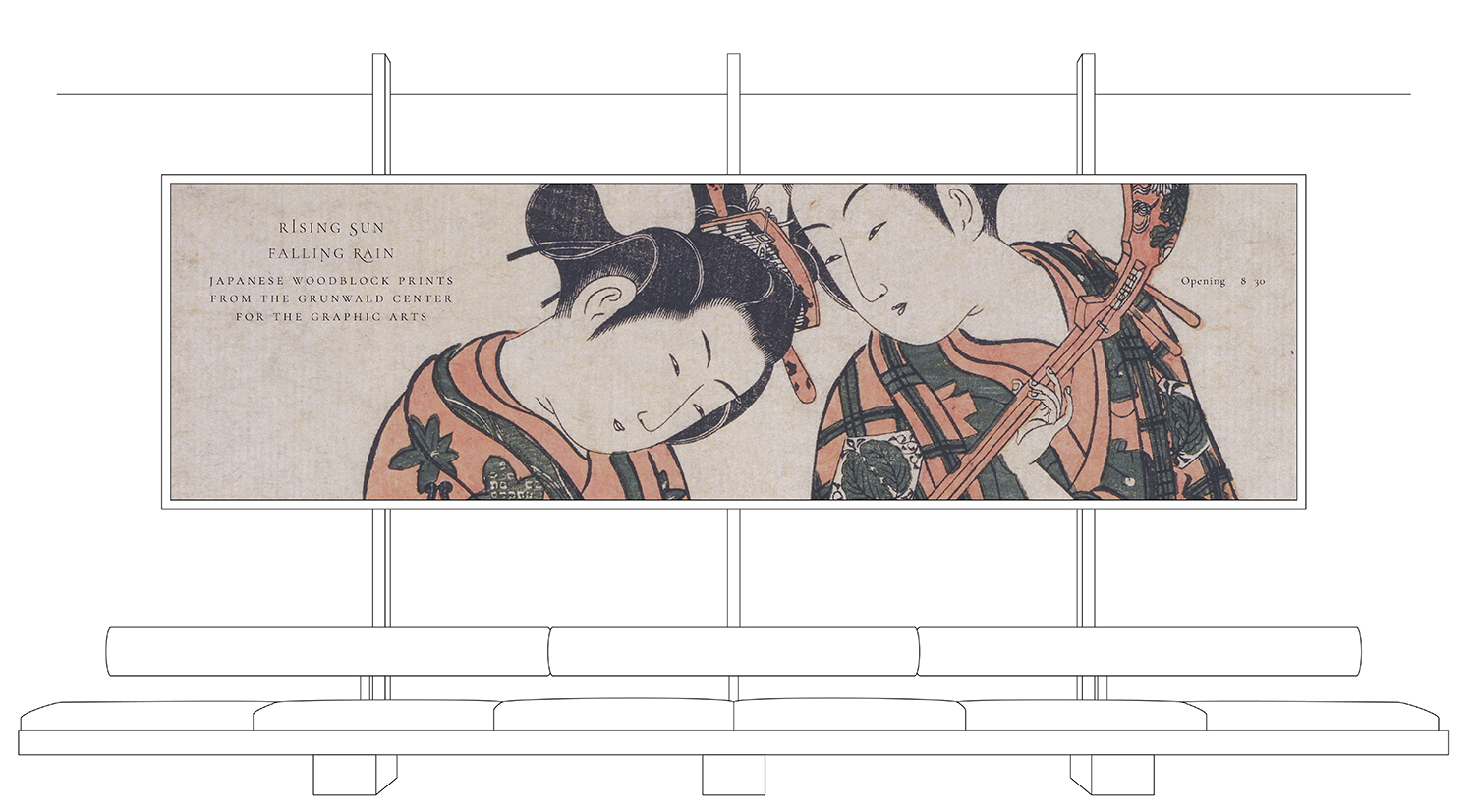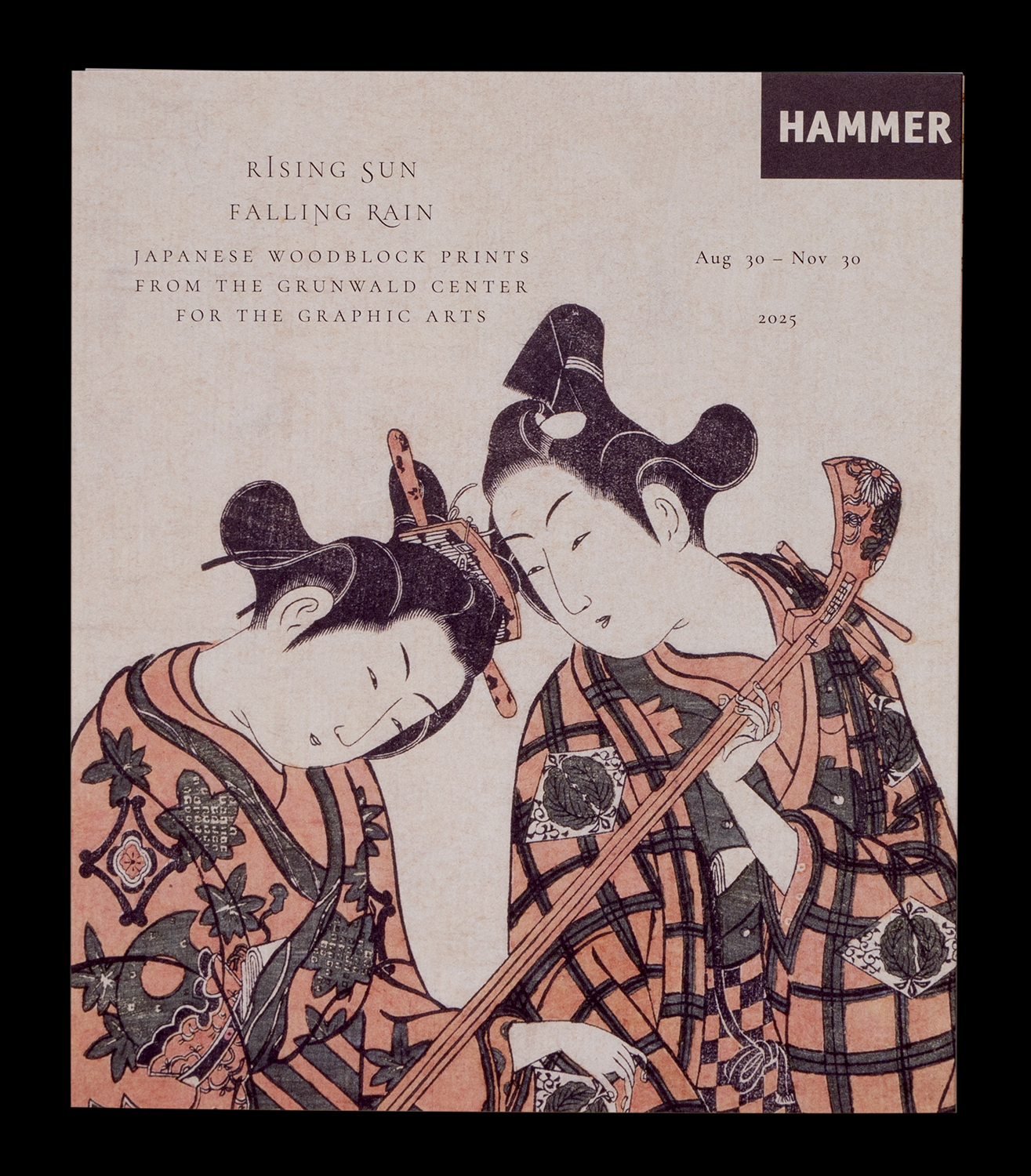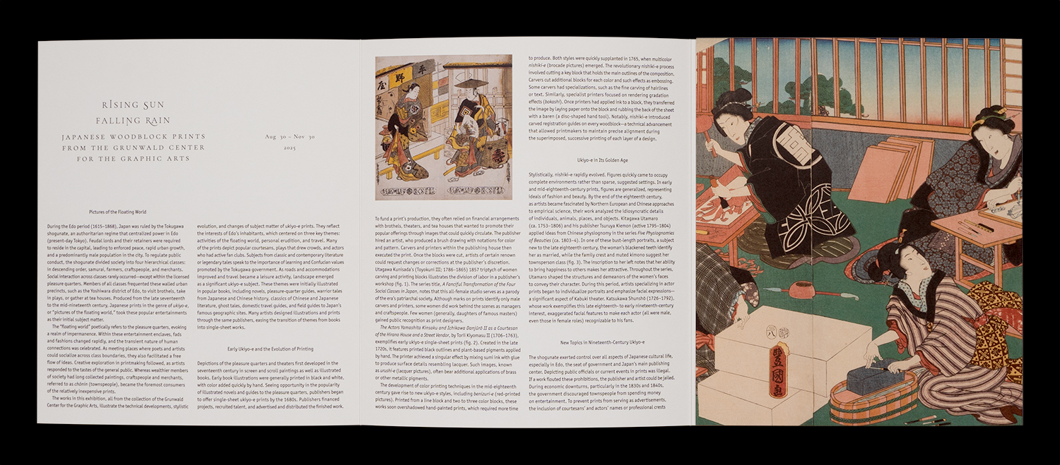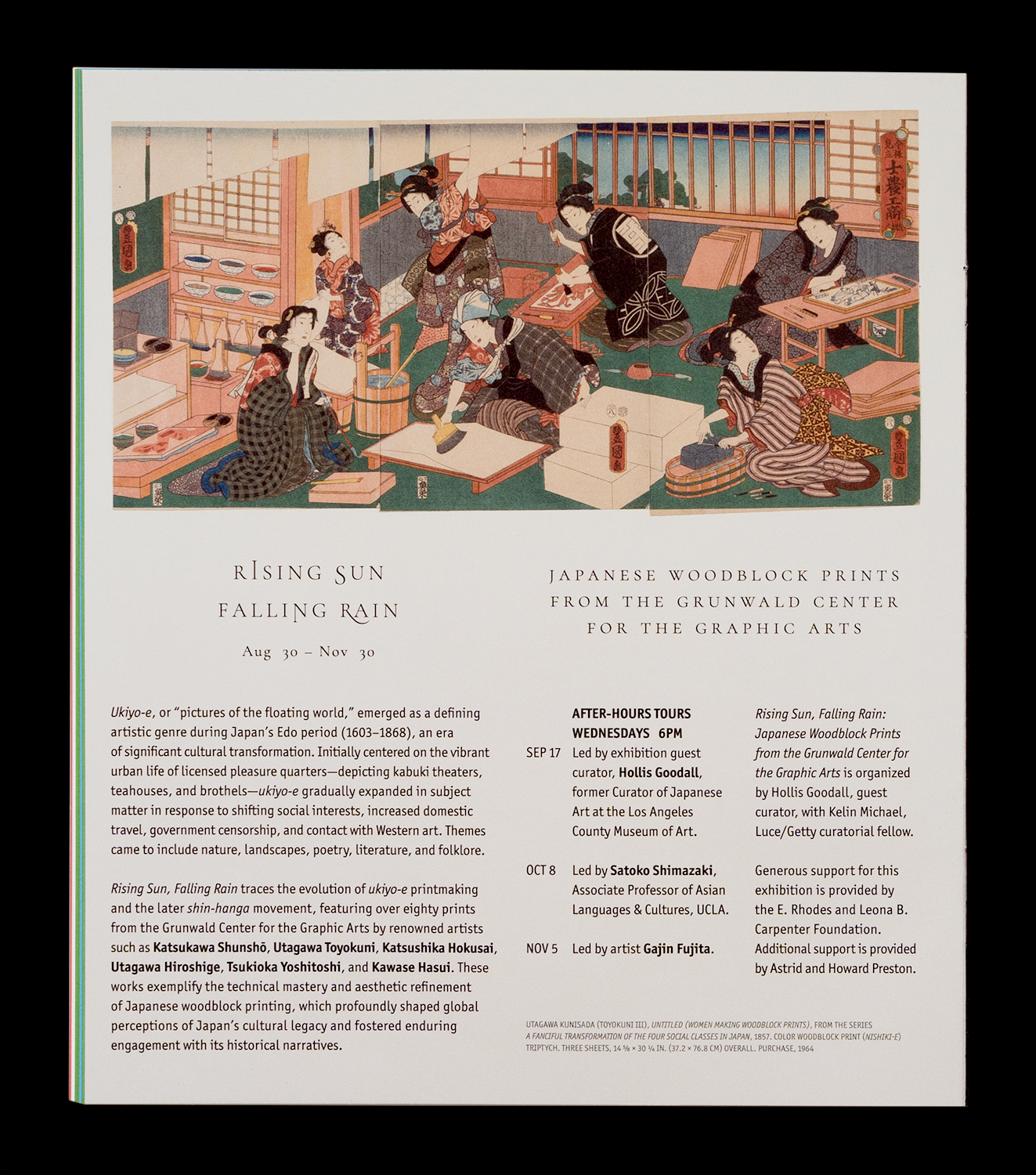 rising sun, falling rain: japanese woodblock prints from the grunwald center for the graphic arts traces the evolution of ukiyo-e printmaking and the later shin-hanga movement. the exhibition features over eighty prints, including works by katsukawa shunshō, utagawa toyokuni, katsushika hokusai, utagawa hiroshige, tsukioka yoshitoshi, and kawase hasui. i've set the identity in cormorant garamond, modified with custom drawn swashes.
