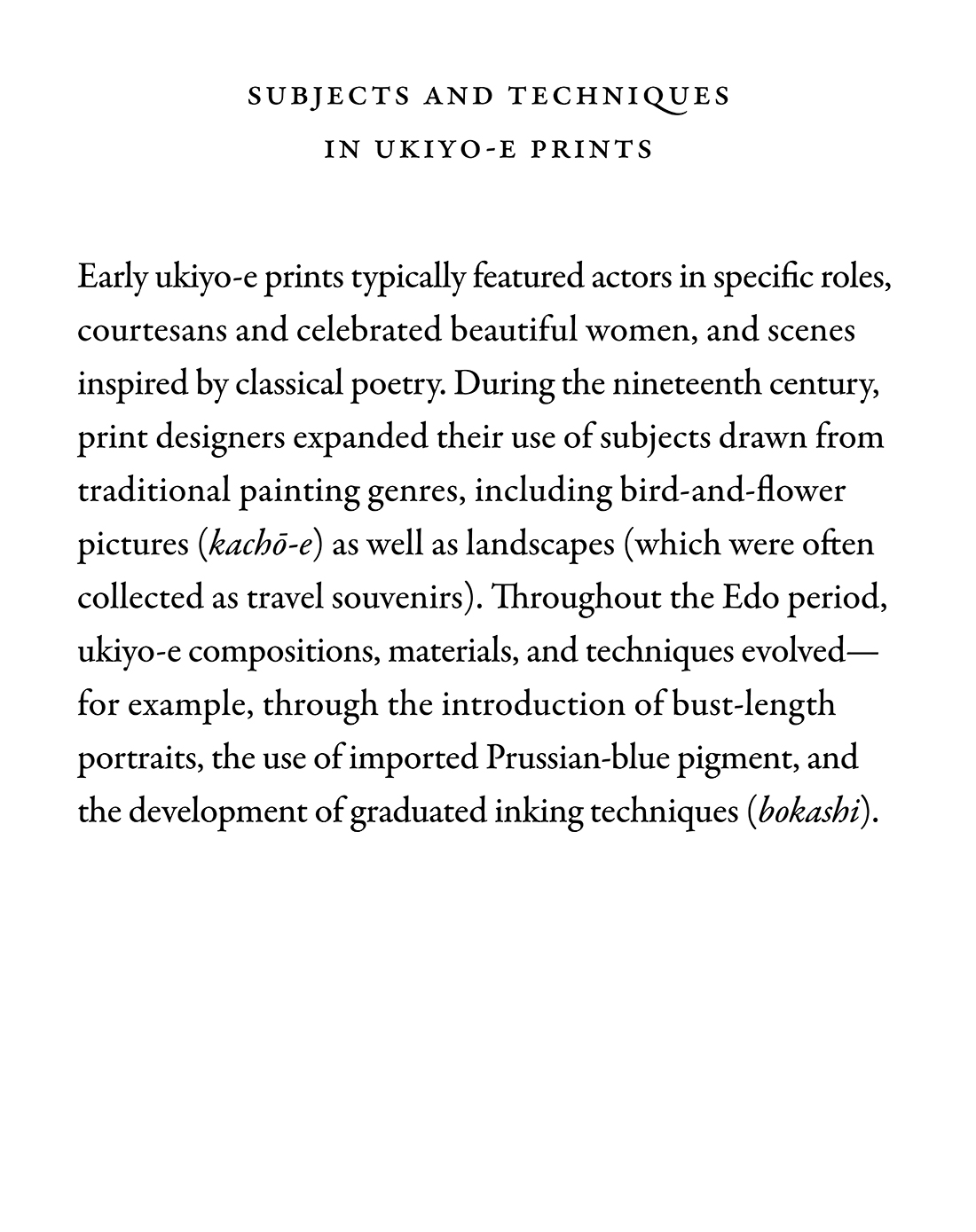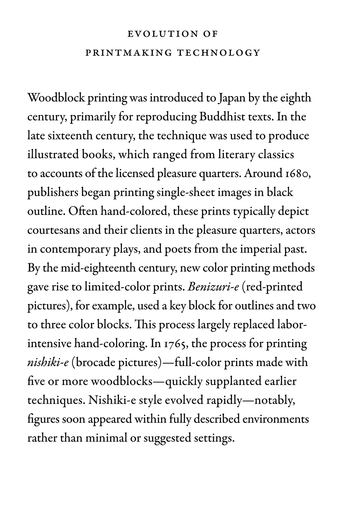 1 the type references historical modes of printing and the availability of this material to a wider general public, highlighting the function of ukiyo-e in creating accessible, affordable works of art for a growing urban middle class.